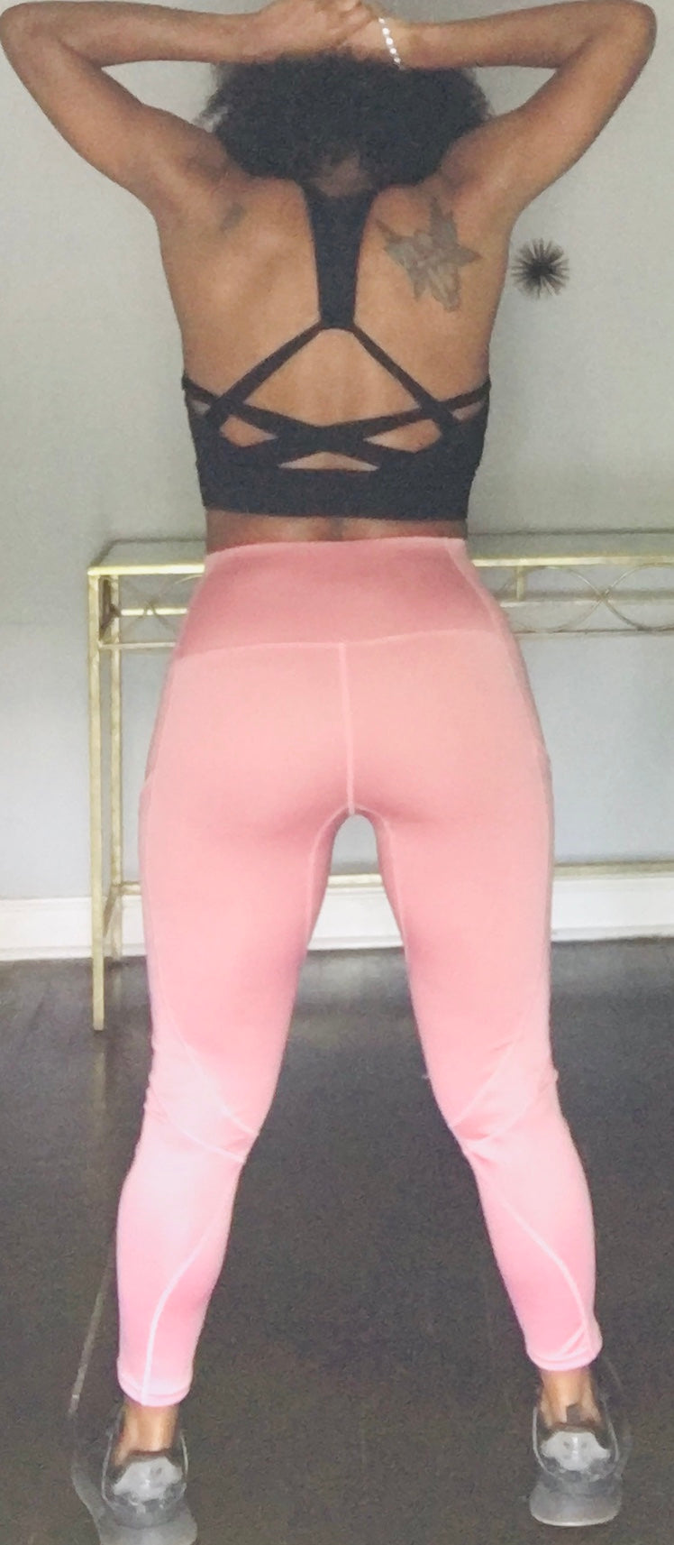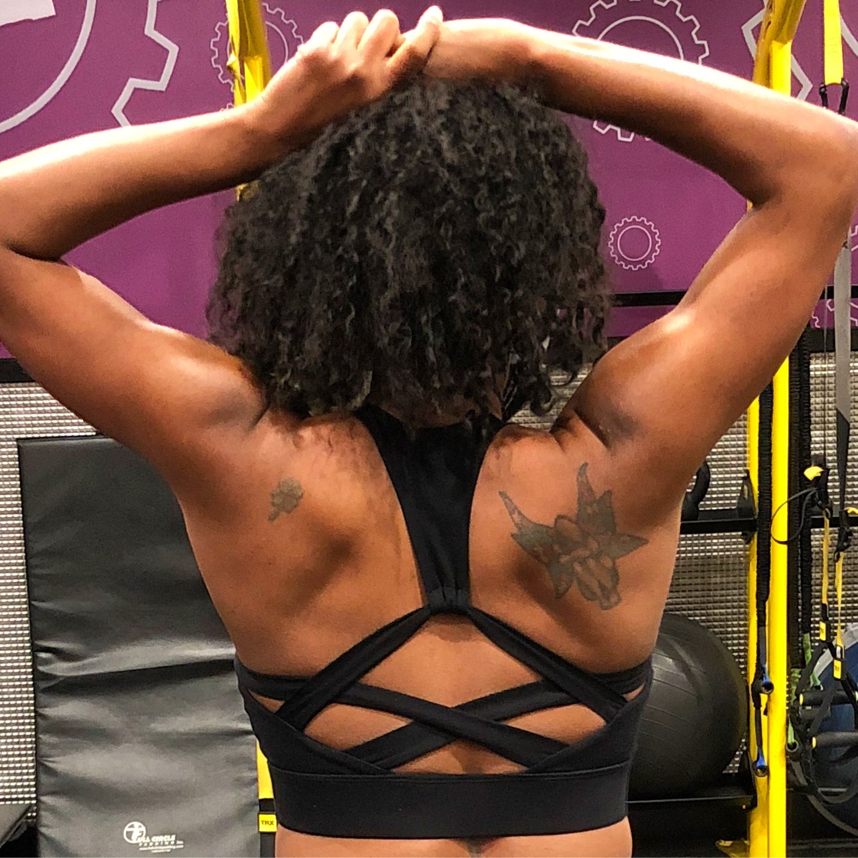 Supportive sports bra with exposed back detail. Can be worn with an outfit a well. Very stretchy, with padded inserts. The material is Nylon/ Spandex